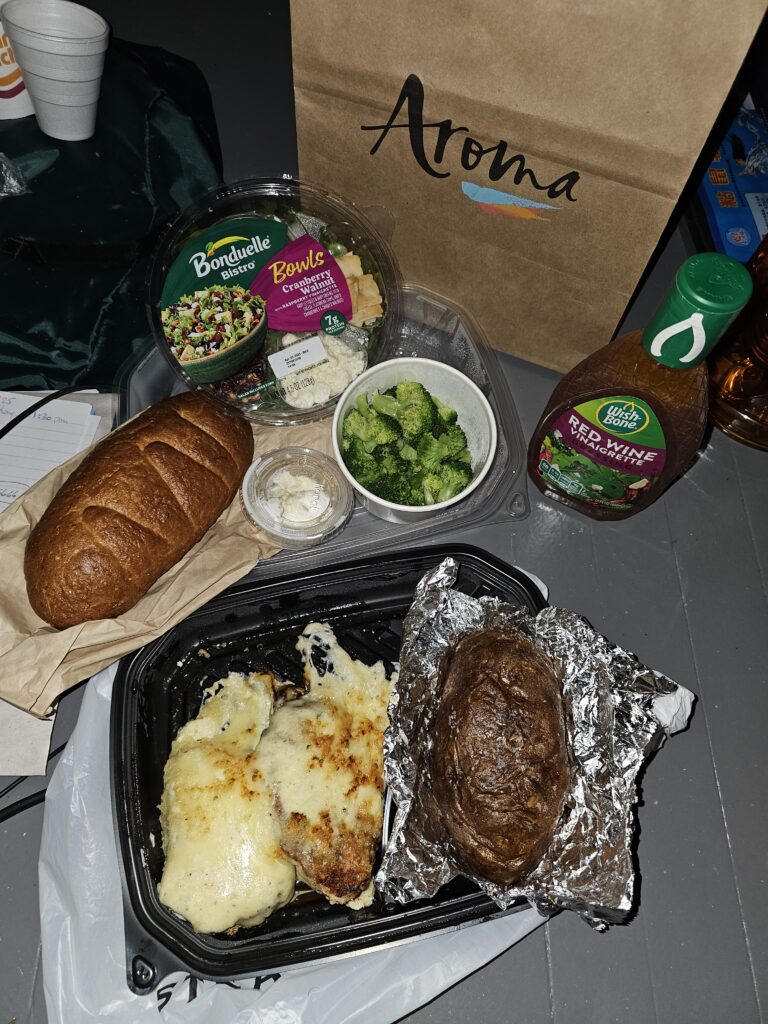 Hühnchen überbacken mit gebackener Kartoffel, Brokkoli, Brot, Butter, Sour Creme und Salat mit Dressing…. schmeckt wunderbar!!